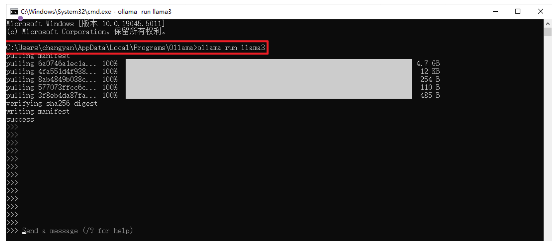 ollama run <模型名称>,首次执行会从模型库中下载模型,所需时间取决于你的网速和模型大小。模型库地址:https://ollama.org.cn/library