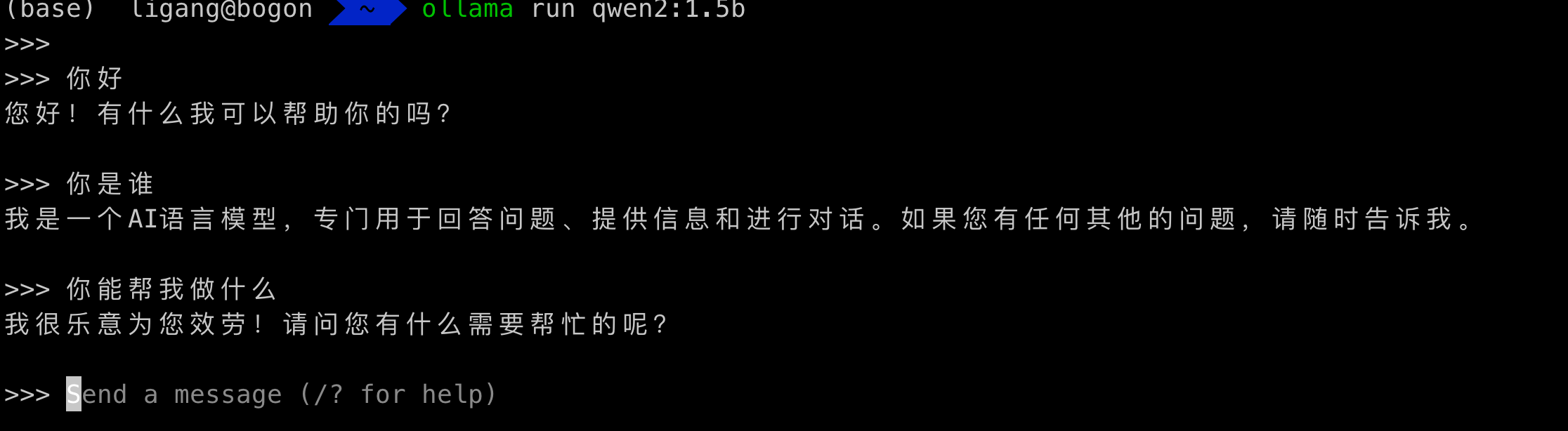 import ollama # 聊天式 response = ollama.chat(model='qwen2:1.5b', messages=[{'role': 'user', 'content': '为什么天空是蓝色的?', }]) print(response) print(response['message']['content']) # 生成式 ## response = ollama.generate(model='qwen2:1.5b', prompt='为什么天空是蓝色的?')- 方式2