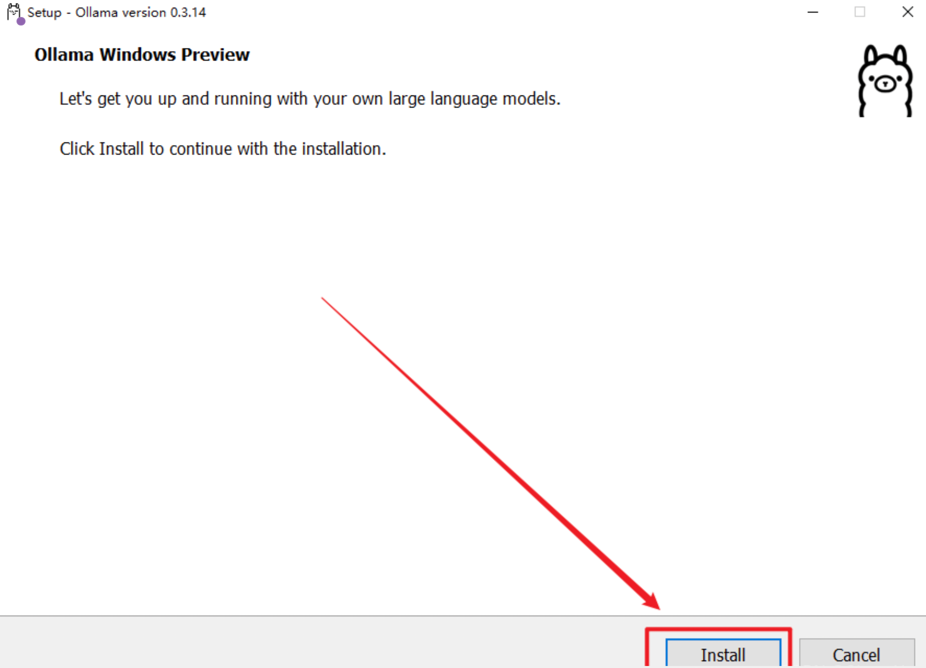 - 双击安装文件,点击「Install」开始安装。目前的Ollama会默认安装到C盘,路径如下:
