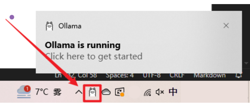- 安装完成后,会在电脑右下角出现Ollama图标,可以不用先启动Ollama,先退出做一些必要路径的配置!右键图标,会出现退出的按钮「Quit Ollama」,注意:一定要退出Ollama,否则下边的环境配置无法生效!