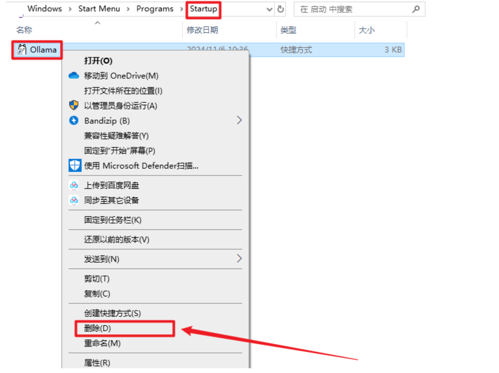 - Ollama 默认会随 Windows 自动启动,可以在「文件资源管理器」的地址栏中访问以下路径,删除其中的Ollama.lnk快捷方式文件,阻止它自动启动。