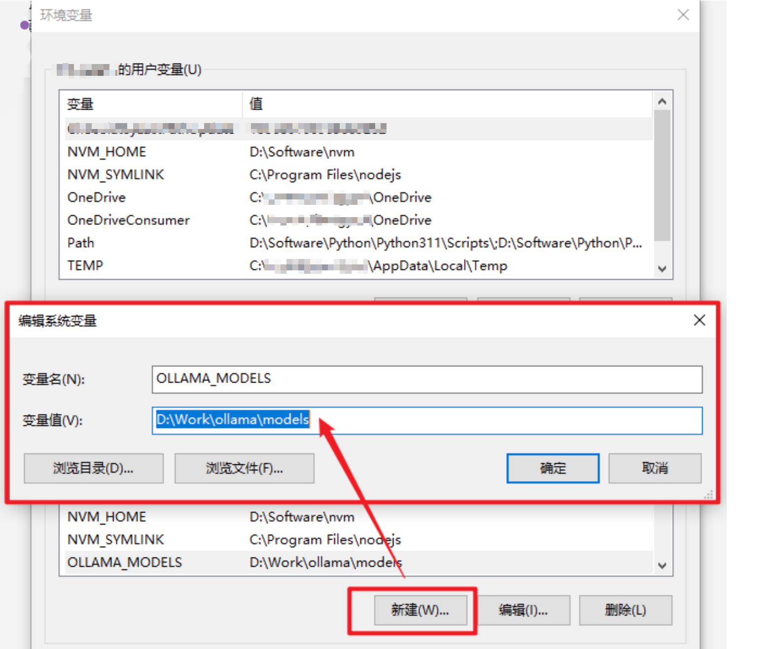 - 变量值(路径):D:\Work\ollama\models