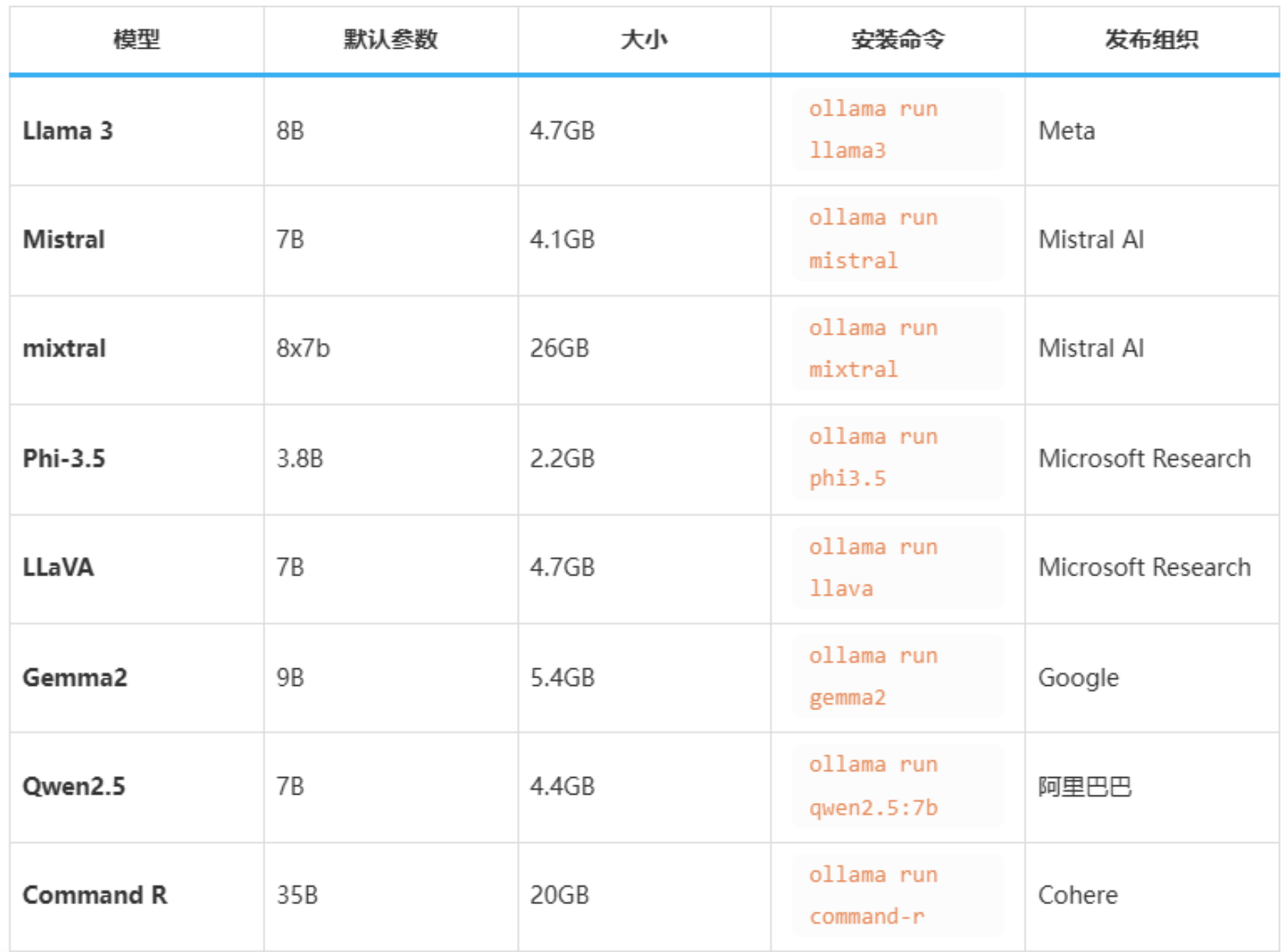- 在Ollama模型库中,比较常用的LLM模型有: