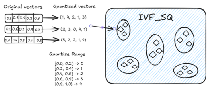 IVF_SQ8:是在 IVF_FLAT 基础上增加了量化步骤的一种索引方法,其核心思想与 IVF_FLAT 类似;IVF_SQ8通过 标量量化 (Scalar Quantization)将每个维度的 4 字节浮点数表示压缩为 1 字节整数表示。